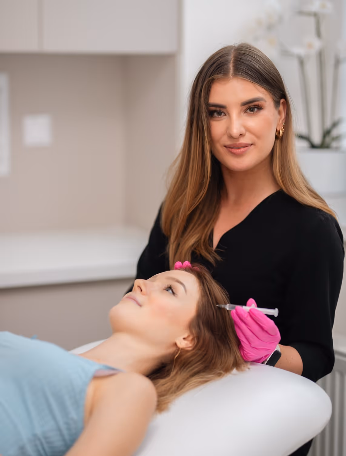 Samotné ošetření trvá přibližně 30 minut. Lékař aplikuje malé množství účinných látek přímo do pokožky hlavy pomocí tenké jehličky. Díky lokálnímu působení je efekt rychlý a cílený. Po zákroku není potřeba žádná rekonvalescence — můžete se vrátit k běžným činnostem.